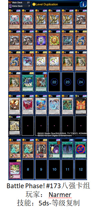 其中Battle Phase! #173的八强Narmer使用的雷龙卡组中加入了“丘比特齐射”,以替代卡组中的“光道”体系,我个人觉得还是有可取之处的。
