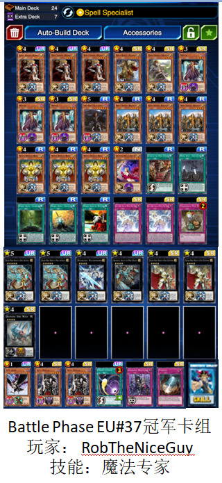 Battle Phase EU#37的冠军是RobTheNiceGuy使用的一套使用“魔法专家”技能的24卡圣骑士卡组,在今天的Meta Weekly #159比赛中,RobTheNiceGuy使用了这一套一模一样的构筑,拿到了16强,足可见这套魔法专家圣骑士卡组也是有值得开发的价值的。