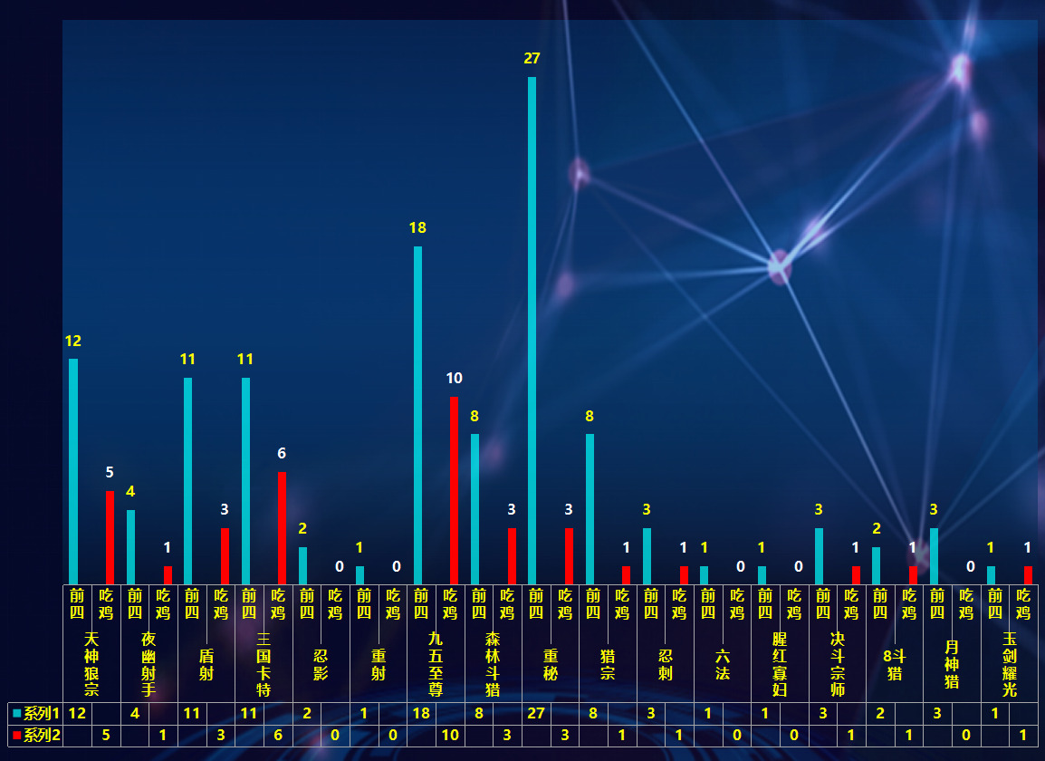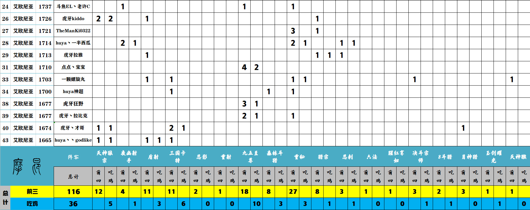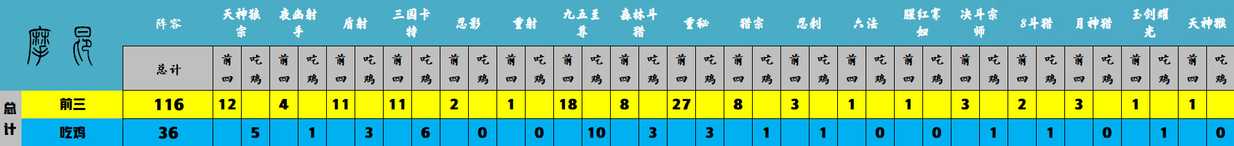 这周赌狗阵容在顶级玩家中玩的人越来越少,统计中赌狗阵容吃到分阵容只有夜幽射手(赌薇恩4场)、忍刺(3场)、忍影(2场)、月神猎(3场)、天神猴(一场),总共才12场,仅站所有吃分场次的10.3%。其中不得不说的是赌狗杠把子月神猎3场吃分场次中吃鸡场次竟是惊人的0场,这是摩昂没想到的。