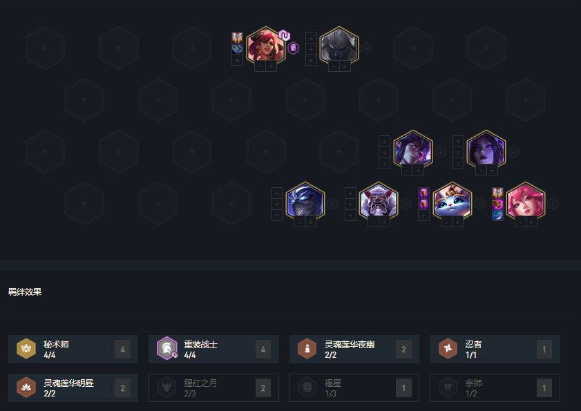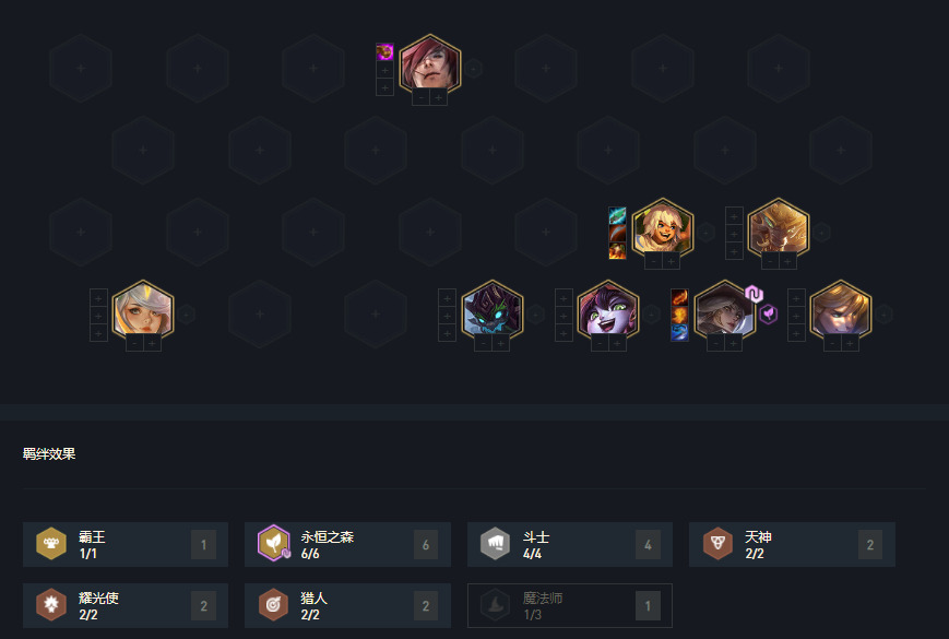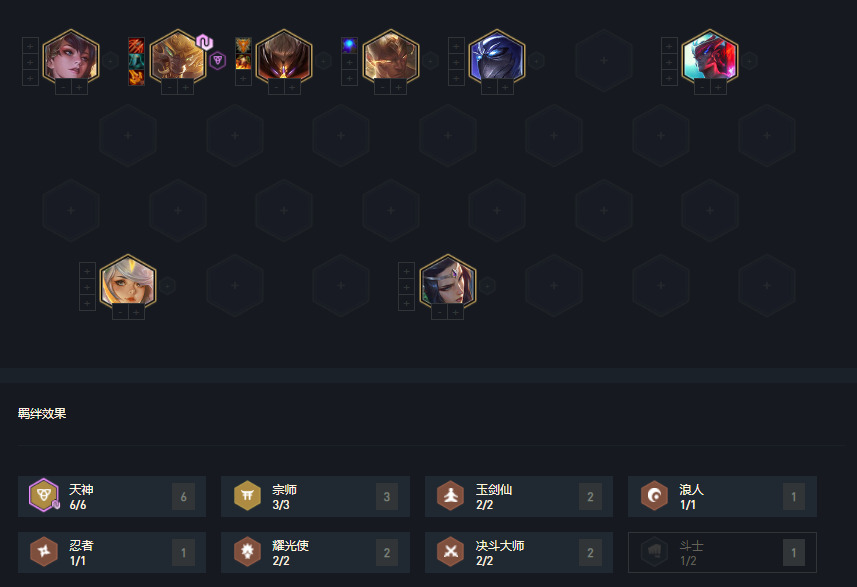 本周统计中天神狼宗阵容应该包含6天神狼就是上图的阵容,和4天神带千珏+5费卡或其他羁绊的阵容。总体来说阵容强度居高,后期对阵重秘大优势,是能踩着重秘上分的阵容。