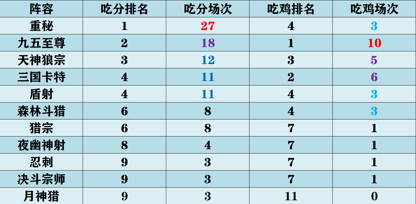 本周统计中盾射吃分场次有些让摩昂意外,重秘阵容的增多,对盾射阵容后期的生存环境不是特别友好,在重秘多的局很难吃到分,狐狸一个技能下去后牌射手阵容基本被融化。统计中盾射吃鸡的几局均势重秘比较少的对局,大家在玩盾射的时候一定要注意。