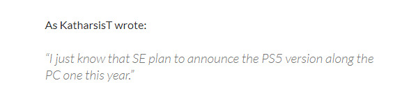 万众期待的史上最佳RPG之一《最终幻想7:重制版》PC版可能终于要来了!今日(1月17日)据外媒报道,Resetera玩家论坛知名爆料人士KatharsisT表示SE社计划在今年同时发布《最终幻想7:重制版》的PC和PS5版。