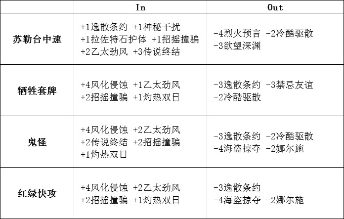 4 风化侵蚀:乍一看以为是用来应对挖坟人囚笼的,但无畏创新是先将牌库中展示的牌放逐,再从放逐区进场,所以组合技并不会被囚笼锁住。那么这里满编风化侵蚀又有什么作用呢?我认为是为了对阵部分套牌时增加更多点去除,风化侵蚀是环境中最好的红色点去除,除了解生物外还能解神器