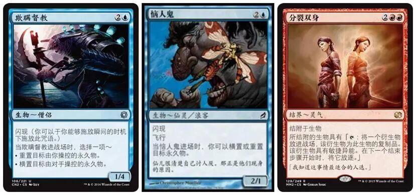 大家对双身组合技一定都不陌生吧,那套牌通过闪现的欺瞒督教或恼人鬼,配合分裂双身来制造无数的敏捷生物从而获取游戏胜利。套牌其他的部分全是去除、反击咒语和一些带干扰的闪现生物,使原本枯燥的组合技套牌玩起来会非常有趣也操控难度非常高。其在当时的摩登赛制中一度是最强套牌(以至于被禁),也是万智牌历史上最成功的组合技之一