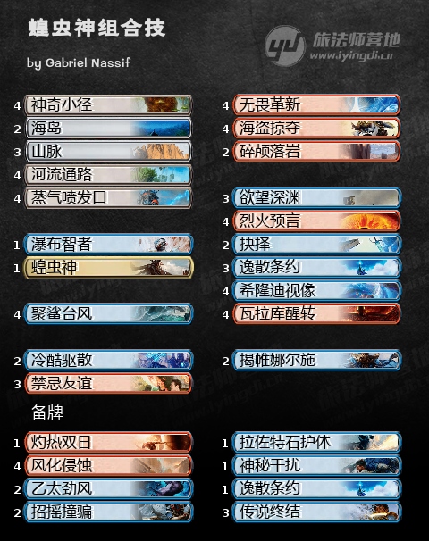 今天要推荐的,是我在史迹构筑中见过的最像双身组合技的套牌——蝗虫神组合技(或者可以称为无畏创新组合技)。这套牌与双身的游戏计划类似,都是先和对手持续互动,然后凑齐组合技制造无数的敏捷生物获取胜利。双身套牌达成组合技需要两张牌,这套牌也类似,需要一张造衍生物的牌和一张无畏创新。套牌最初由 k_prinz 构组,而我今天推荐的是来自 Gabriel Nassif 正在玩的牌表
