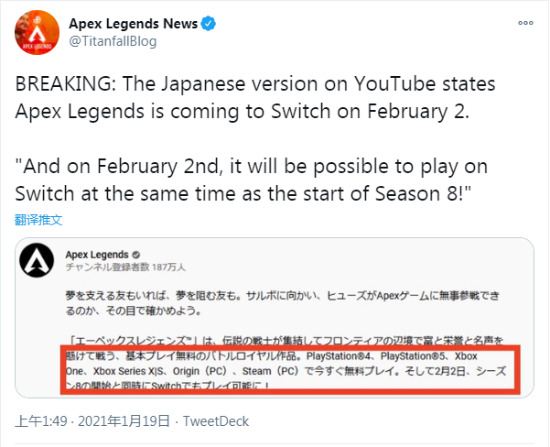 据ComicBook报道,推特博主Apex Legends News(《Apex英雄》新闻)今日在日语版的官方YouTube信息中加入了“在今年2月2日第八赛季开始的同时,玩家可在Nintendo Switch平台上游玩《Apex英雄》。”但这条消息随后被删除,英文版YouTube频道上则从未出现过该消息。