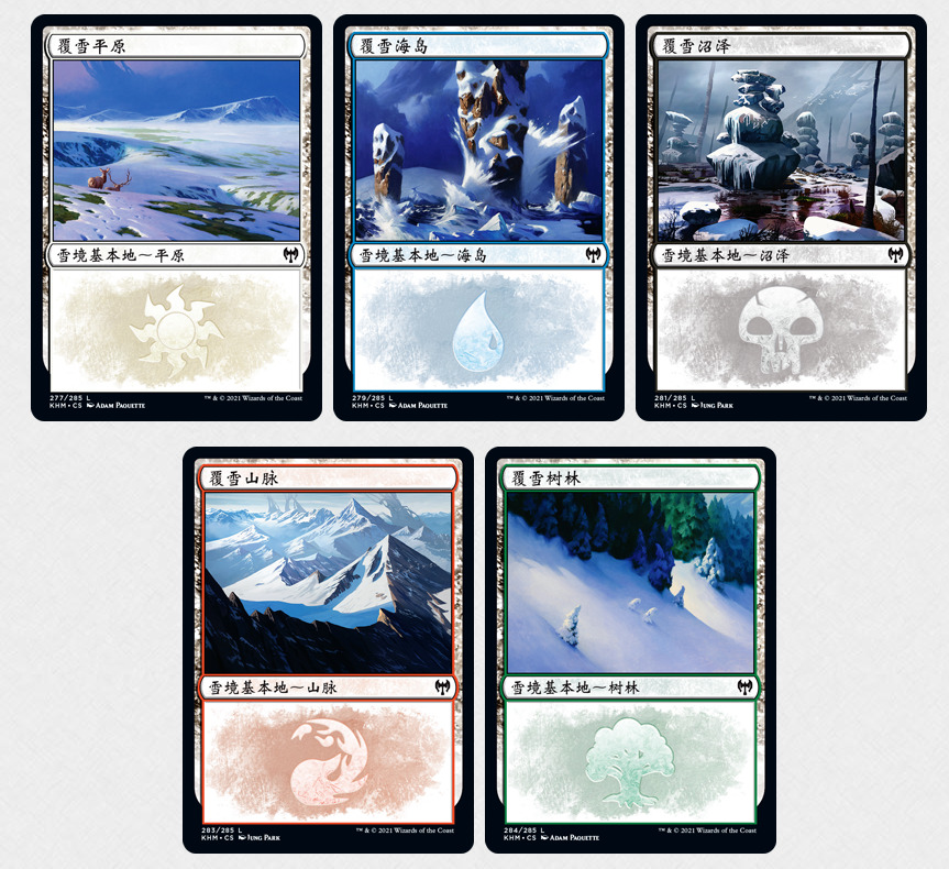 一个北欧系列一直都想要一个寒冷的主题。如果我们可以使用雪境的话,那系列设计决定将它加入系列就很合理了。任何寒冷主题的卡牌都获得这个关键词,而雪境主题(包含雪境法术力)也被放到系列中。基本地被改为覆雪基本地,然后我们也加入了一个覆雪双色地的循环。