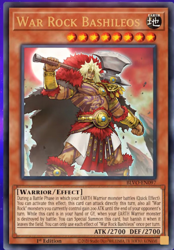 自己的战士族·地属性怪兽进行战斗的战斗步骤内(快速效果):可以发动这个效果;这个回合,这张卡可以直接攻击。自己场上的“WAR ROCK”怪兽的攻击力直到对方回合结束时上升200。这张卡在手卡·墓地存在,自己的战士族·地属性怪兽被战斗破坏的场合:可以把这张卡特殊召唤。这个效果特殊召唤的这张卡从场上离开的场合除外。“WAR ROCK BASHILEOS”的每个效果1回合各能使用1次。