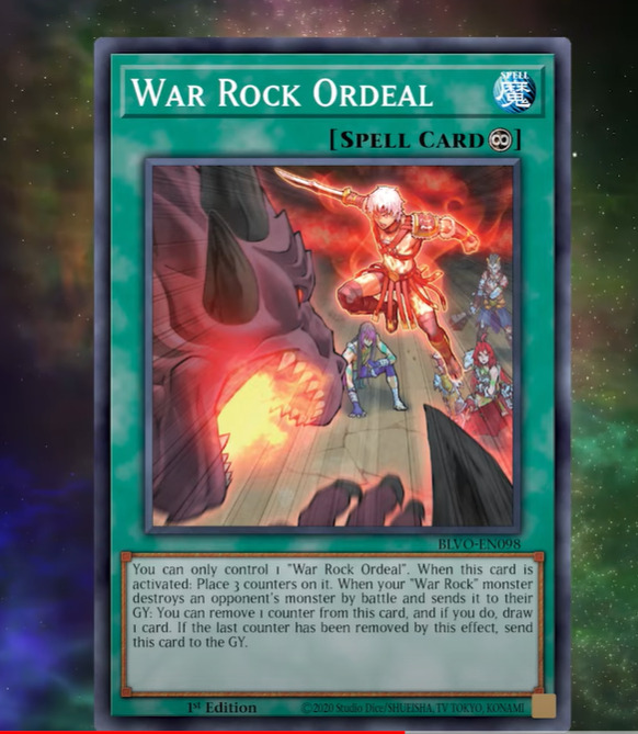 “WAR ROCK ORDEAL”在自己场上只能有1张表侧表示存在。作为这张卡发动时的效果处理:在这张卡上放置3个指示物。自己的“WAR ROCK”怪兽战斗破坏对方怪兽送去墓地的场合:这张卡1个指示物取除,自己从卡组抽1张。这张卡的指示物全部被取除的场合,这张卡送去墓地。