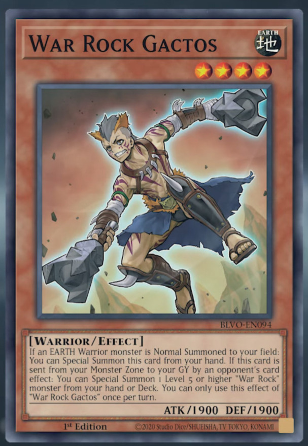 自己场上有战士族·地属性怪兽通常召唤的场合:可以从手卡把这张卡特殊召唤。怪兽区域的这张卡被对方的卡的效果送去墓地的场合:可以从手卡·卡组把1只5星以上的“WAR ROCK”怪兽特殊召唤。“WAR ROCK GACTOS”的这个效果1回合之内使用1次。
