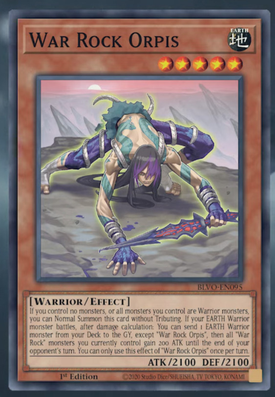 自己场上的怪兽不存在的场合或者只有战士族怪兽的场合,这张卡可以不用解放作召唤。自己的战士族·地属性怪兽进行战斗的伤害计算后:可以从卡组把“WAR ROCK ORPIS”以外的1只战士族·地属性怪兽送去墓地。那之后,自己场上的“WAR ROCK”怪兽的攻击力直到对方回合结束时上升200。“WAR ROCK ORPIS”的这个效果1回合只能使用1次。
