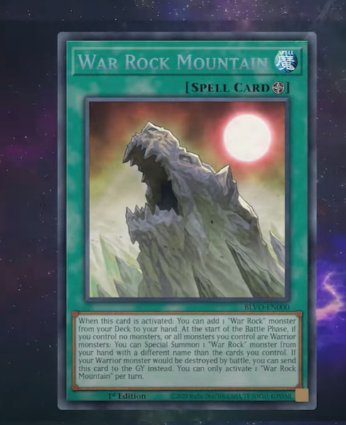 作为这张卡发动时的效果处理:可以从卡组把1只“WAR ROCK”怪兽加入手卡。战斗阶段开始时,自己场上的怪兽不存在的场合或者只有战士族怪兽的场合:可以从手卡把1只同名卡不在自己场上存在的“WAR ROCK”怪兽特殊召唤。自己的战士族怪兽被战斗破坏的场合,可以作为代替把场上的这张卡送去墓地。“WAR ROCK MOUNTAIN”在1回合只能发动1张。