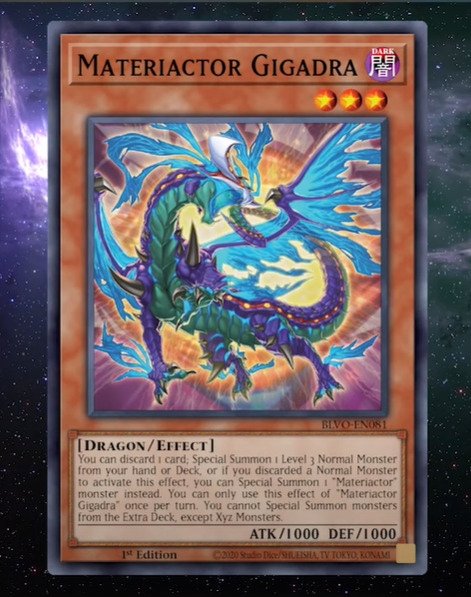 可以丢弃1张手卡;从手卡·卡组把1只3星通常怪兽特殊召唤。把通常怪兽丢弃来让这个效果发动的场合,可以作为代替把1只“MATERIACTOR”怪兽特殊召唤。“MATERIACTOR GIGADRA”的这个效果1回合只能使用1次。自己不是XYZ怪兽不能从额外卡组特殊召唤。