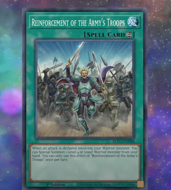 自己的战士族怪兽进行战斗的攻击宣言时:可以从手卡把1只4星以下的战士族怪兽特殊召唤。“REINFORCEMENT OF THE ARMY'S TROOPS”的这个效果1回合只能使用1次。
