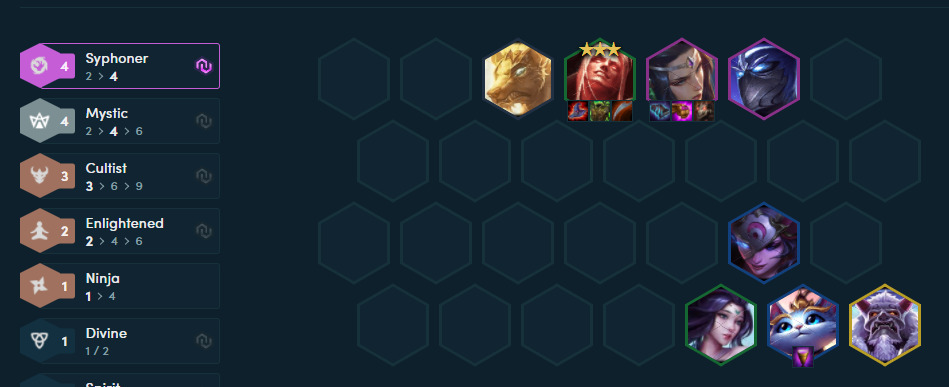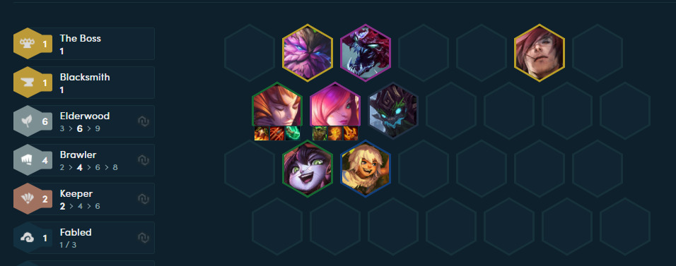 在测试服测试阵容摩昂觉得霞是这版本的一个BUG级别的超强C位(感觉正式上线会再次被削弱)。以霞为核心的阵容有很多,但6森一定是最稳定的,上图阵容不吃天选,森林、裁决(3-4裁决)、神盾(4神盾)、法师(龙王)均可搭配,4斗并非必须的可根据对局情况搭配。