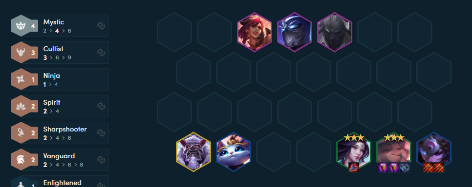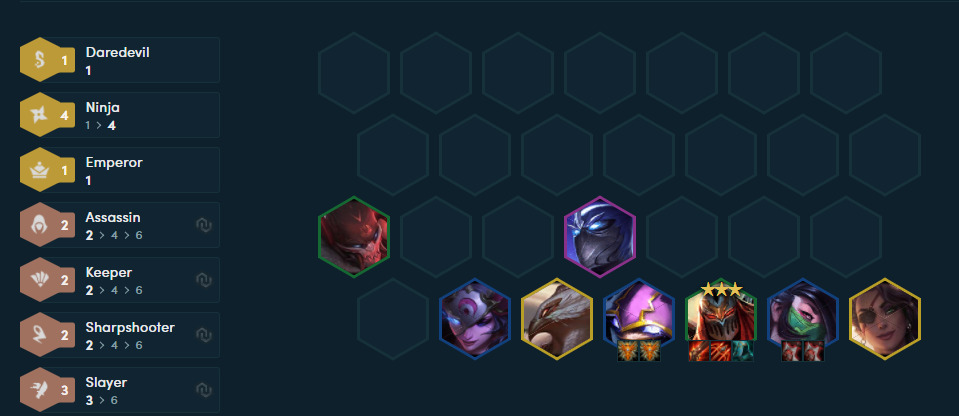 忍者阵容做为测试服热门阵容。阵容摩昂想了很久还是选择给大家推荐这套,这套忍者拼多多成型后强度很高。忍者阵容其实很多样化主要就是看主C选择谁,是劫还是阿卡丽。刺客这版本强度提升很高,暴击与爆伤都提升了,4忍4刺/6刺,强度都很高,主C还是阿卡丽。