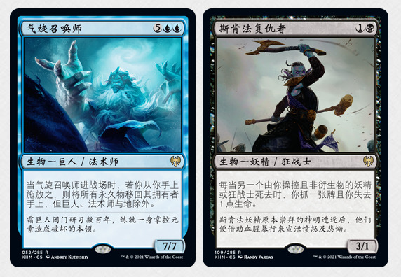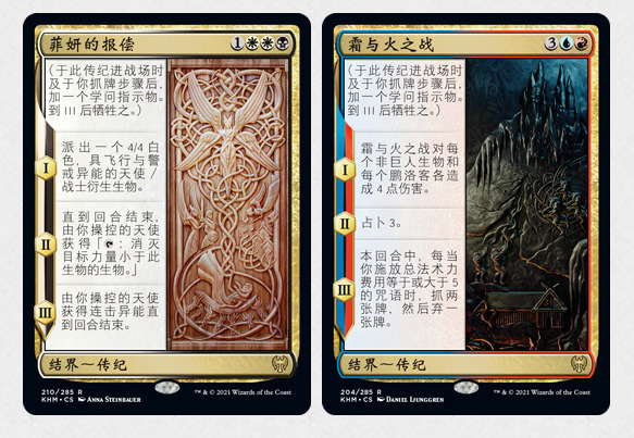 「传纪」一词源自于古北欧语。在这个系列把它们做进来感觉有很强的正当性。专注在强调每一个境域都聚焦在一个色组时,我渴望能够简单地探索双色传纪的设计空间,首次让他们拥有两种以上的颜色。最终,我们在每一个境域都配置了至少一个传纪,但有些传记更适合去讲述不属于该色组的境域故事。