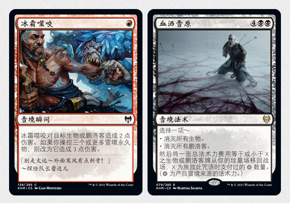 我不在意一些内部对于这个机制的疑虑,并且迈向了一条覆雪之路。鉴于摩登新篇也使用了这个机制,我认为我们应该尽可能在此尝试创新。在我早期对雪境的探索中,我曾思考过它出现在非永久物牌上的意义。尽管最终的结果并没有具备多大的突破性意义,但我对我们最终加入游戏中的雪境主题瞬间与雪境主题法术感到满意。