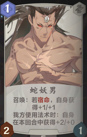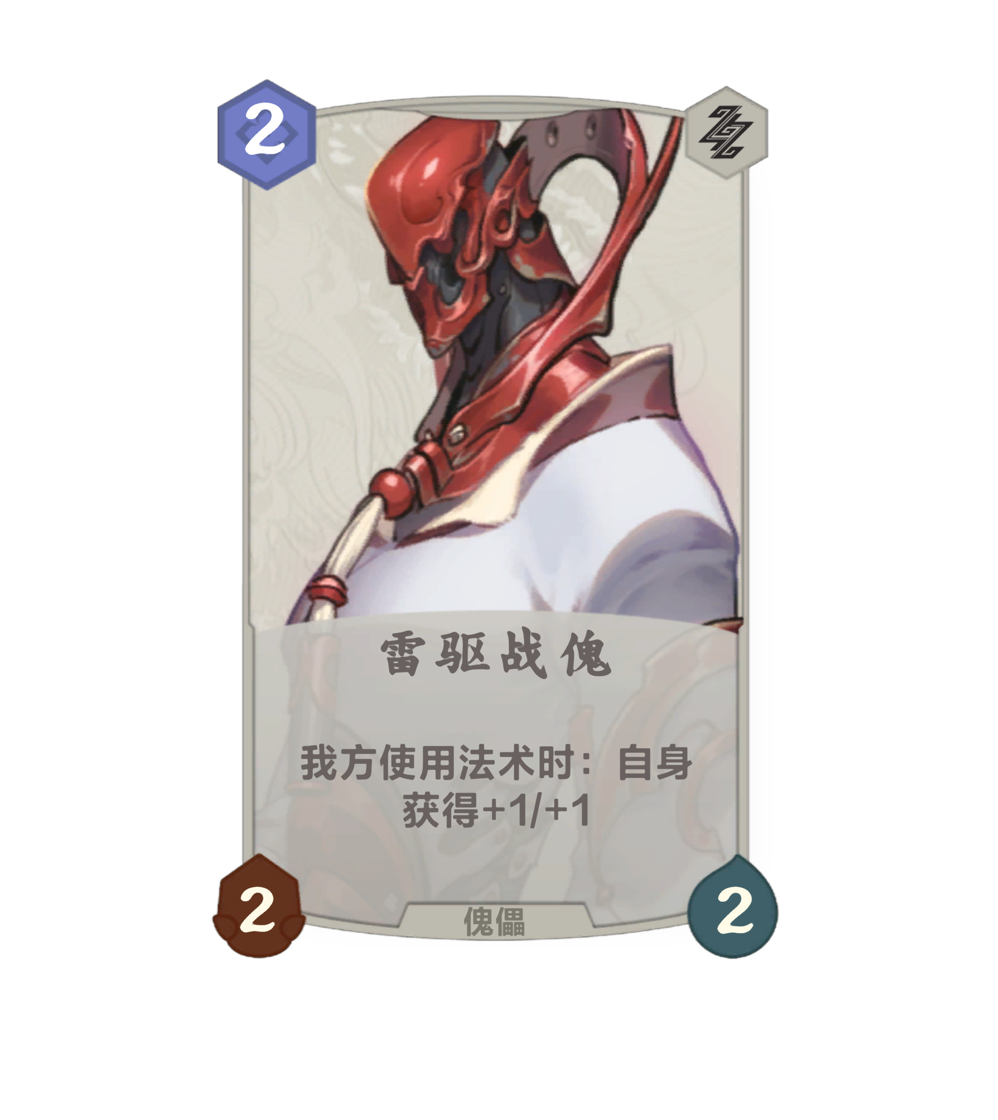 这两个放在一起说,1费蛇妖男2费桃木剑+其他任意法术的情况下,一旦打脸成功可以造成10点伤害,可谓恐怖,美中不足他是个脆皮,但可以通过外挂1-2张洪荒觉醒来达到保护的作用,要用好这张卡你得有风骚的走位,然后在心中默默祈祷对方卡手。雷驱战傀看似弱鸡,但由于自身的膨胀特性 如果对方没有及时解掉,威力也十分恐怖而且还会很肉进行各种优势交换很让人头疼