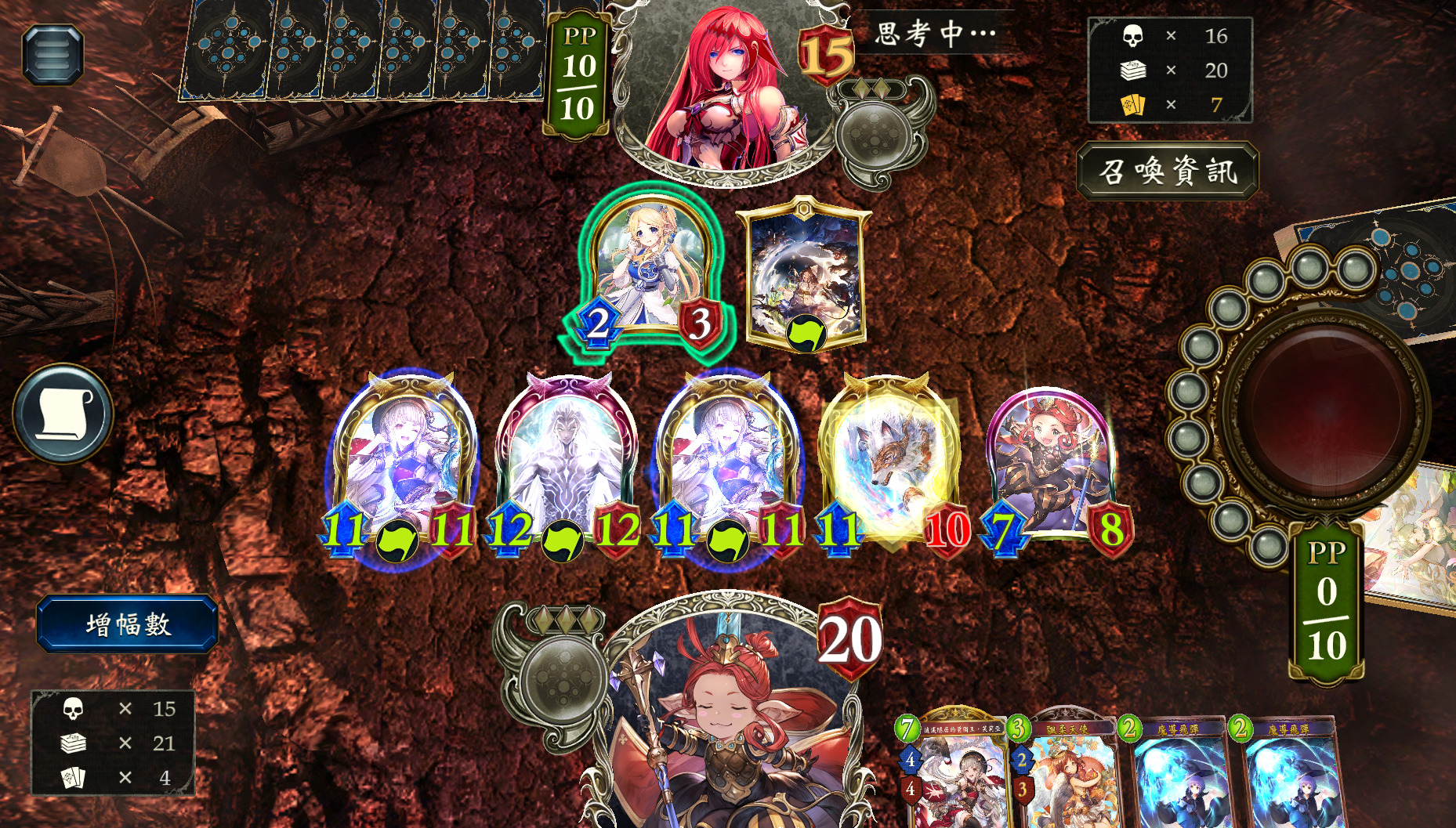 此外,在前期有2张愚者的情况下,第3、4回合各使用1张剥落,便能在第8回合时将对手血量上限减至11,此时依次使用UB凯留和魔导飞弹,同样可以完成斩杀。