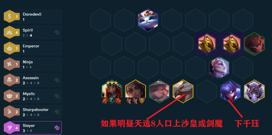 如果是明昼天选或猫咪秘术天选,8人口还可以挂永恩或者沙皇,沙皇>永恩。沙皇有2个小弟沙兵,我们阵容无前排,这样可以为猫咪分担一部分压力。如果时光2星替换风女可考虑上剑魔,剑的控制非常足,特别是缩角站位的直接拉出来,劫就能先杀掉。