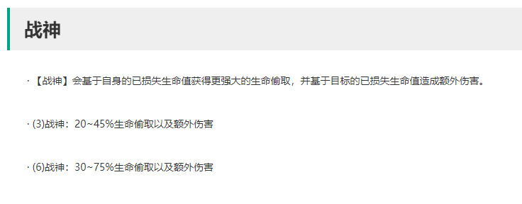 另一个羁绊是战神,3战神羁绊下会根据自身已经损失的生命值获得20-45%生命窃取,劫的续航能力得到保证;3战神羁绊下劫还会对目标造成目标已损失生命值的20-45%的额外伤害,这个就变态了,敌方掉血越多,劫的伤害就越高。