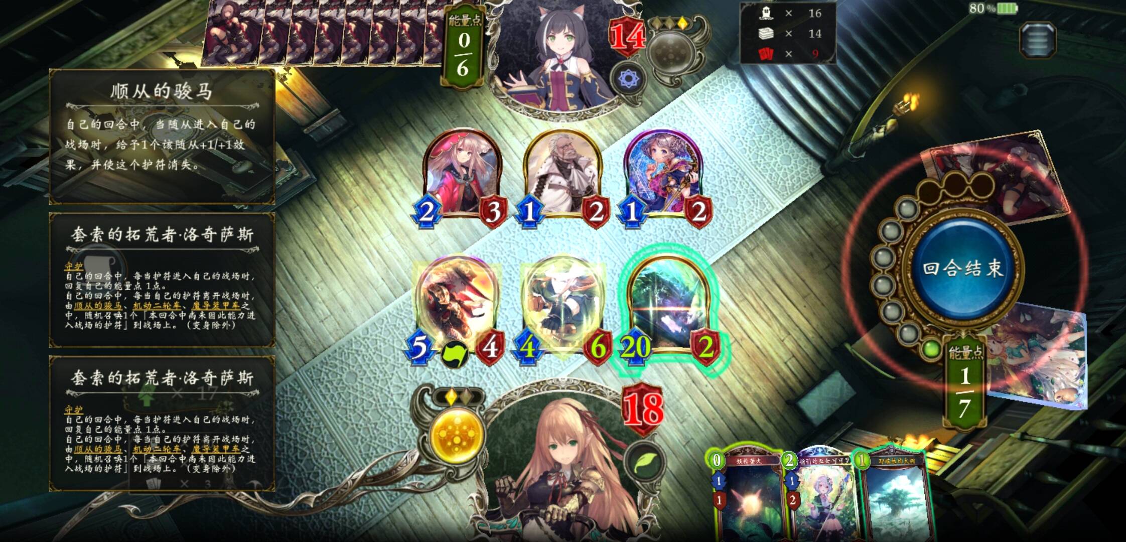 而起手绝对不留的牌有两张,自然玛纳和猫姐妹,因为它们与辅助前期运转苟活滤牌和斩杀绝对核心这两点都无关。然后是还有一张个人习惯绝对不留的牌,森林之狼,这算是我打了很久学到的一点,理由是用它刷牌很容易导致爆牌,优先度没有迅风精灵高,迅风的萤火是随时可以丢出的,而且配合可可萝表现很好,萤火也可以保留作斩杀回合的连击,还可以出完牛仔载具,还能与牧地巨人本体同出护脸,这些都是森林之狼无法比的。
