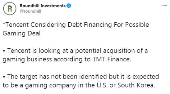 据TMT Finance报道称:腾讯目前正考虑进行游戏交易的债务融资,并计划继续收购美国或韩国的大型游戏公司。