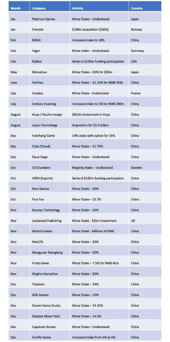 著名数据网站Niko Partners近期也总结了腾讯2020年投资、收购游戏公司的多项内容:在今年,腾讯的投资交易量较去年增加了300%,其投资以及收购的公司名单中增加了31家,是19年交易数量的三倍。