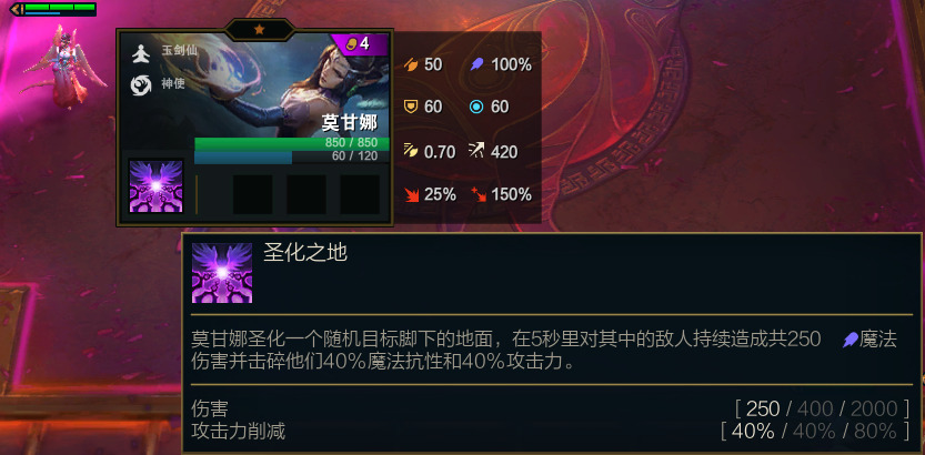 玉剑羁绊这版本回蓝量超高,4玉剑羁绊下,莫甘娜只需要3次普攻就能释放技能,而第二次释放技能也只需要6次普攻。莫甘娜技能范围超大,造成伤害的同时还能降低敌方攻击力与魔抗。莫甘娜双抗60搭配2神使羁绊的回血莫甘娜简直就是一只打不死的小强,超级肉。