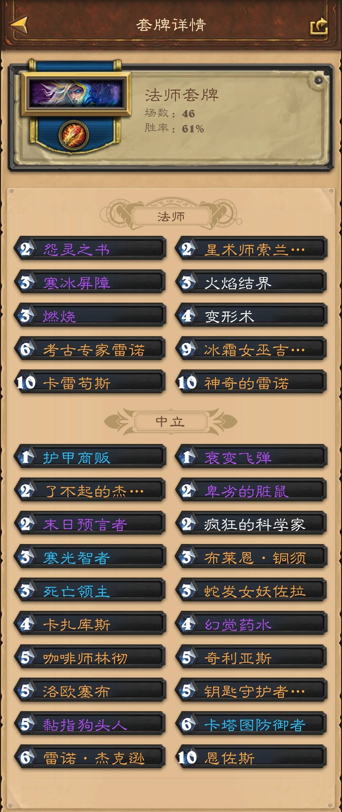 法师:以奥秘法为主,也存在一部分任务法(奇迹法和少量无限火球法)以及极少的宇宙控制法。因为其他形态法师占总数较少,统一按奥秘法对待。起手推荐留牌:末日预言者、护甲商贩和各种嘲讽随从回血随从。