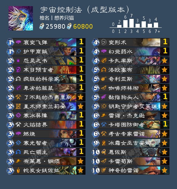 大家好,我是椎名(游戏id:椎名丨想养只猫#5291),今天给大家带来的是狂野控制宇宙法。提到宇宙控制法,各位总是觉得又贵又不能上分,不适合狂野环境。但是暗月竞速赛上线以来,狂野环境发生了较大的变化,最明显的变化就是弑君贼的兴起以及农夫术(牧)的产生。与此同时,黑眼术的出场率有所下降。对环境进行分析之后,我组了这套宇宙控制法。这套卡组最大的特点就是具有抗快攻和破坏otk的能力。我用这套宇宙法从2200名开打,对局50+把(有几把盒子没记录上),以60%的胜率打到了600名,并最终稳定在680名。在对局过程中我也在不断修改卡组,另外与好友对战了将近20把(特别感谢好友西电丨绫波家绿箭以及船船丨想养只水母),最终得出兼具厚度与快攻抗性的版本。
