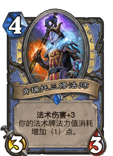 此外,很多人看到肯瑞托三修法师的负面效果,通常都不愿拿它,但三修法师其实很强。如果我们打过一次洪流,大部分法术都是相当于原费用打出去,那么三修法师+考前刷夜五费摸四张岂不是很香?配合奥术飞弹一费打6,都是一波爆发。最后他还是一个33的软嘲,如果对手不处理,都很难站住怪。