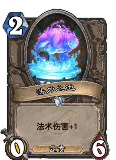 在1法强随从方面,选择其实是很灵活的。血法虽然是万金油,但手牌过多时肯定不能拿,而老王(研究伙伴)零费可出,身材标准,也是很灵活的选择。法力之池在我们魔翼鸦的构筑中反而发挥良好,因为血量大,一点法强也能配合我们冗余的奥术飞弹等解牌,更好地处理场面,对手也会纠结——究竟是解这个6血还是不解呢?