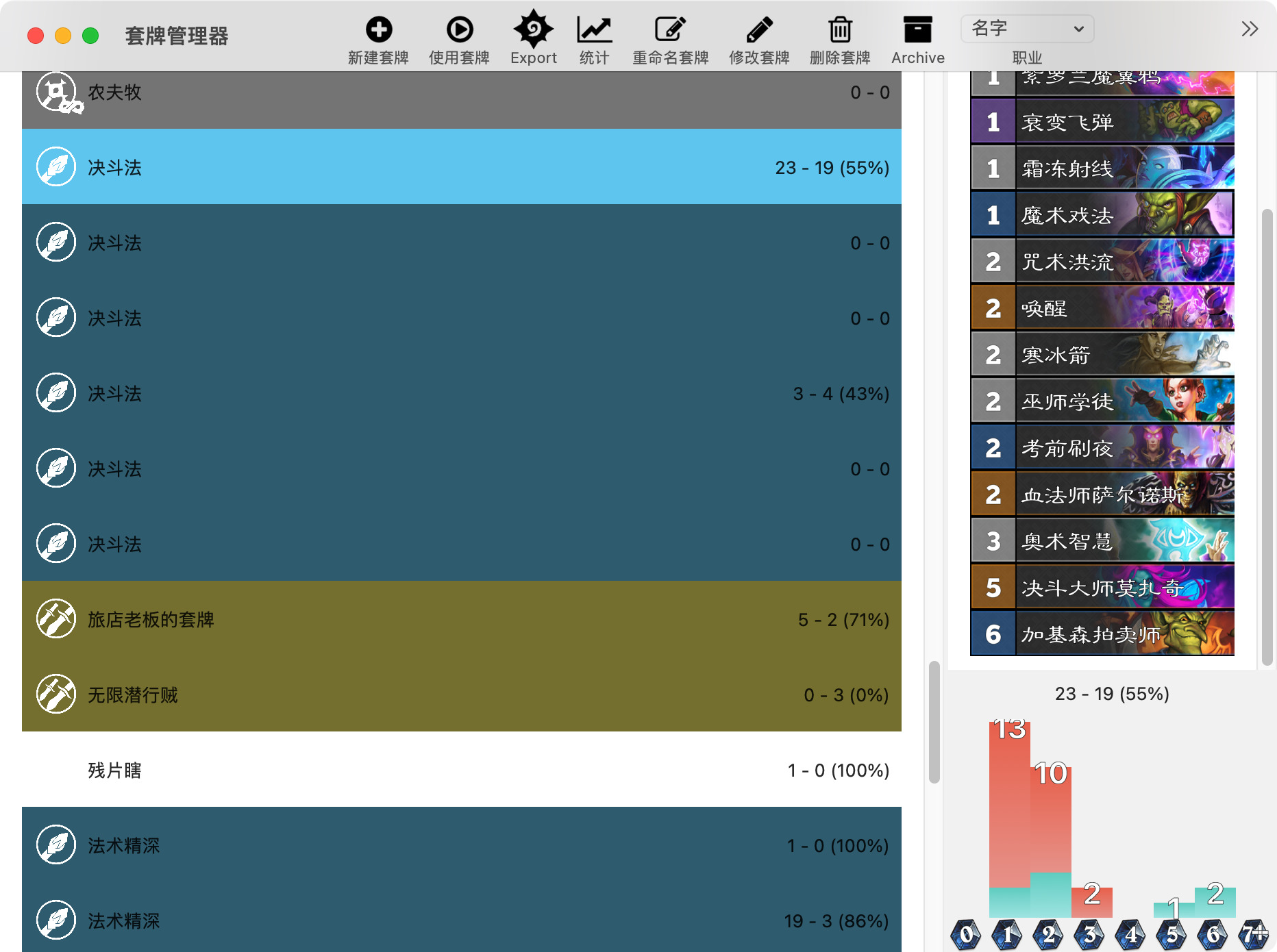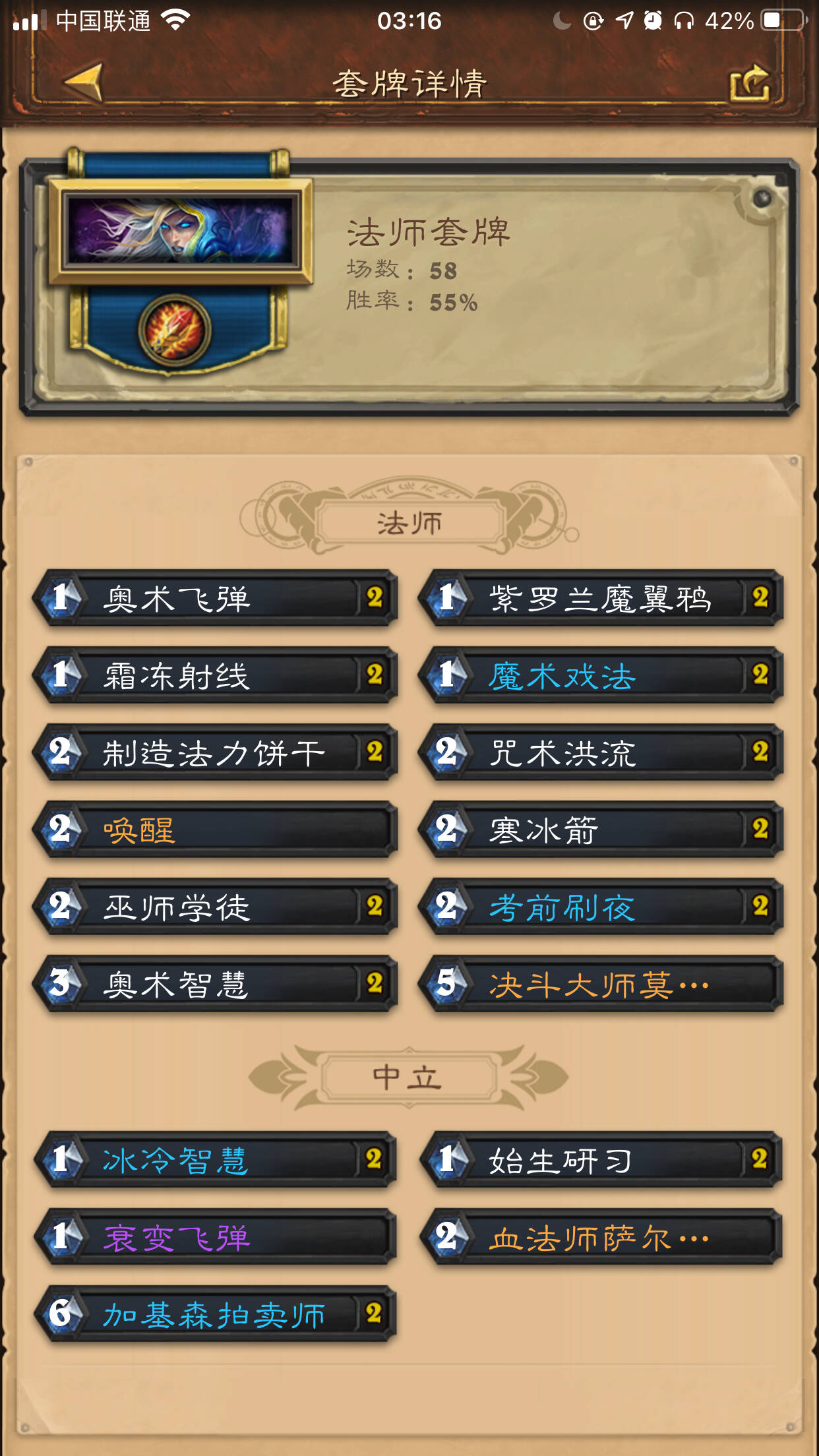 根据炉石传说助手显示,我打了58把,于是我在助手上筛选了近五十八把法师对局,手动统计结果如下: