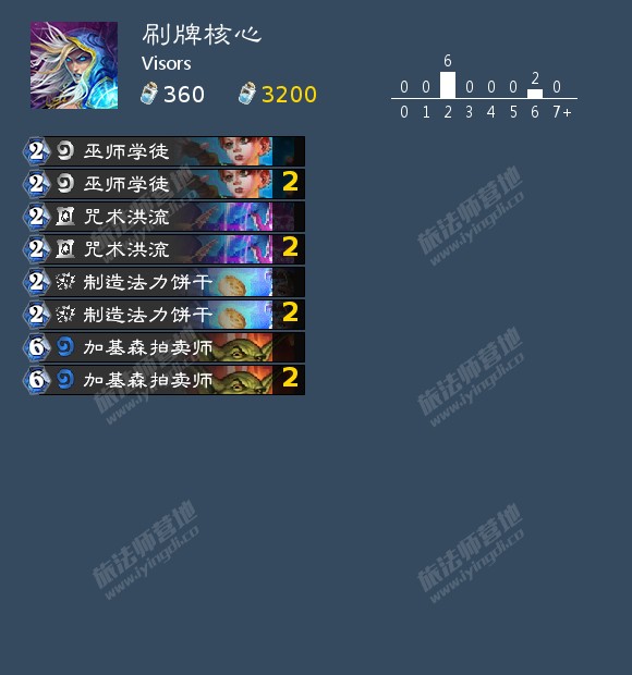 扩展上线后,我和几个老法师爱好者讨论起了法师的出路。一开始我们都想爽几把无限火球法,可惜大法师瓦格斯+幻觉药水+哀绿(巫师学徒)+制造法力饼干的组件实在是太多了,根本苟不到组件凑齐。而后我在Twitch上看到了一套决斗法,感觉非常有意思,原卡组如下: