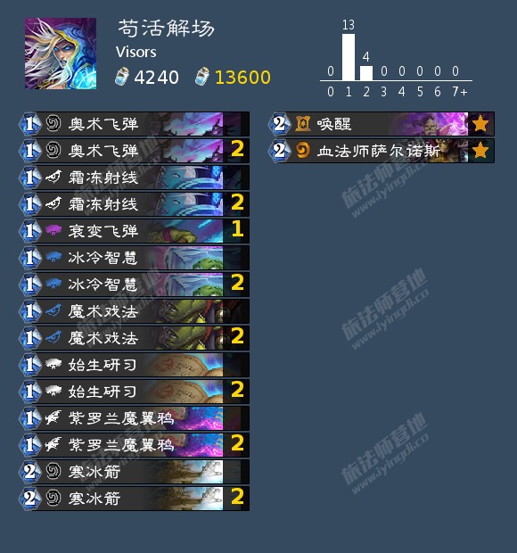 没错,由于我们拥有紫罗兰魔翼鸦,实际上我们拥有的伤害牌是6张,因此前期我们可以大胆地交出奥术飞弹和寒冰箭处理场面(当然,优先级还是靠后,毕竟是斩杀用的),寒冰箭冰脸在防刀贼和瞎子的爆发时有奇效。