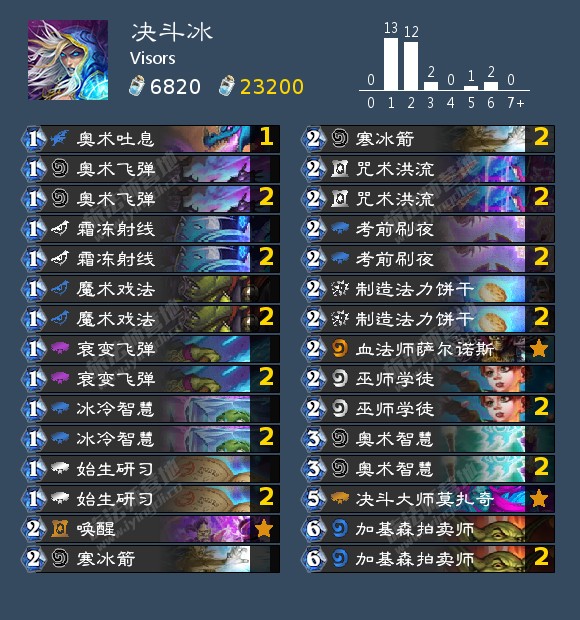 我的好友gck上周分享给我一副套牌,卡组思路是采用决斗大师和巫师学徒配合考前刷夜单回合打出十几张卡牌刷高法强,最后用寒冰箭和奥术飞弹完成斩杀。卡组前期运营寄希望于使用奥秘苟活并过牌,然后博学者排序后接赛格尽快抽齐key牌完成斩杀。我在观看他游戏几局后感觉非常有意思,遂抄来玩了一下,由于我没有赛格,便加入了一张唤醒,在天梯上尝试几把后,发现这种思路下的赛格还是核心,便没再使用。但这段使用经历使我对现在加基森决斗法的体系有了更好的理解。