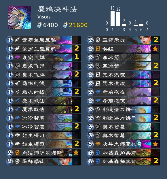 选择紫罗兰魔翼鸦的原因是,面对潜行贼时,起手留下魔翼鸦,回手的奥术飞弹可以灵活地处理一些潜行随从,极大地提升了我们在这个大劣对局中获胜的可能;在面对慢速卡组时,提供更多的伤害,或配合加基森刷牌。同时由于我们最多有四张奥术飞弹,在最后斩杀时,即使没有寒冰箭,我们也能使用低费解牌尽可能清理场面,然后打出多张奥术飞弹完成斩杀(四张通常可以打60点伤害左右,对于大多数对局来说绰绰有余)。这也意味着,我们可以在前期大胆交出我们的寒冰箭,解黑眼等大核心,或者冻脸卡住瞎子和贼的刀,实战中我经常通过这一技巧残血完成大劣对局的翻盘。