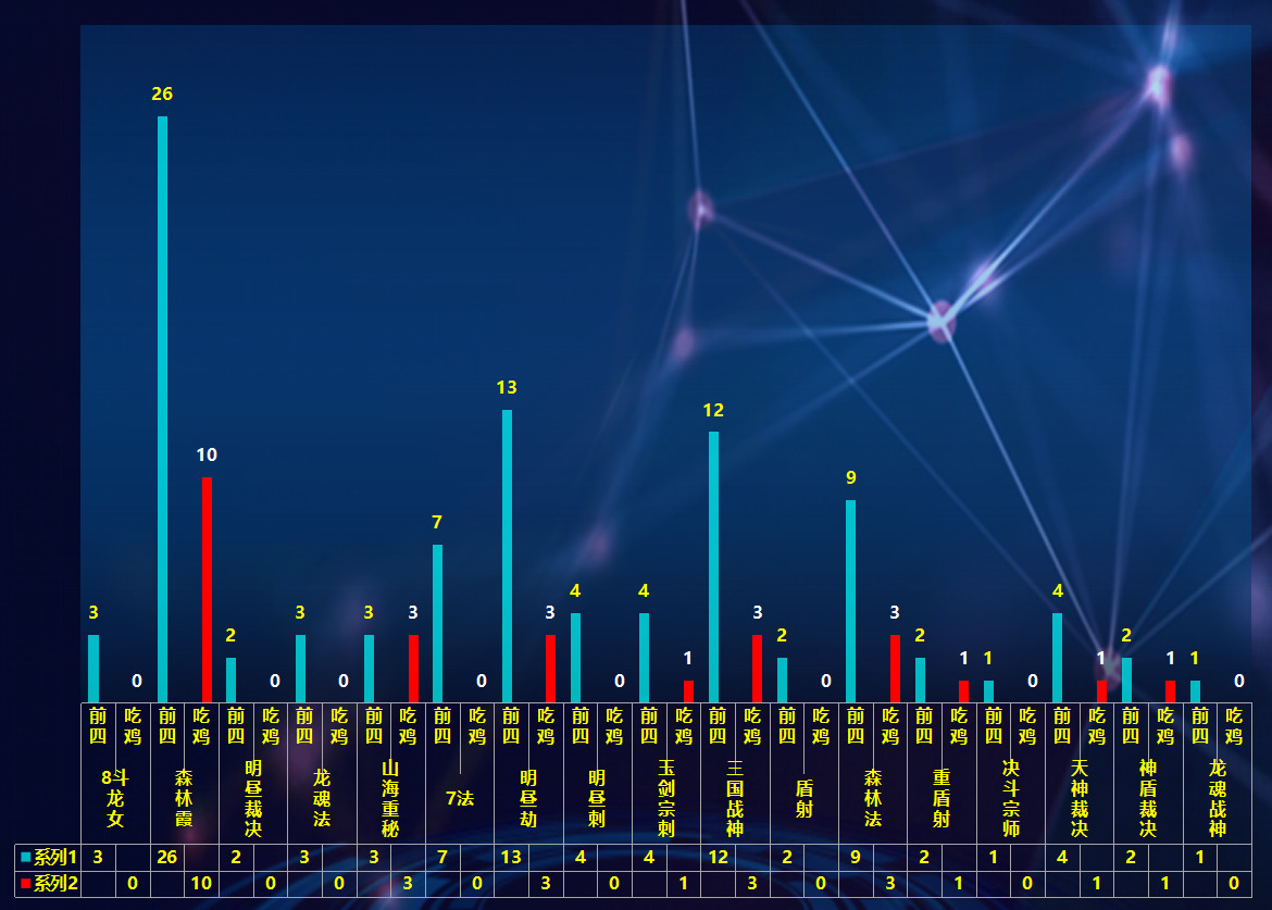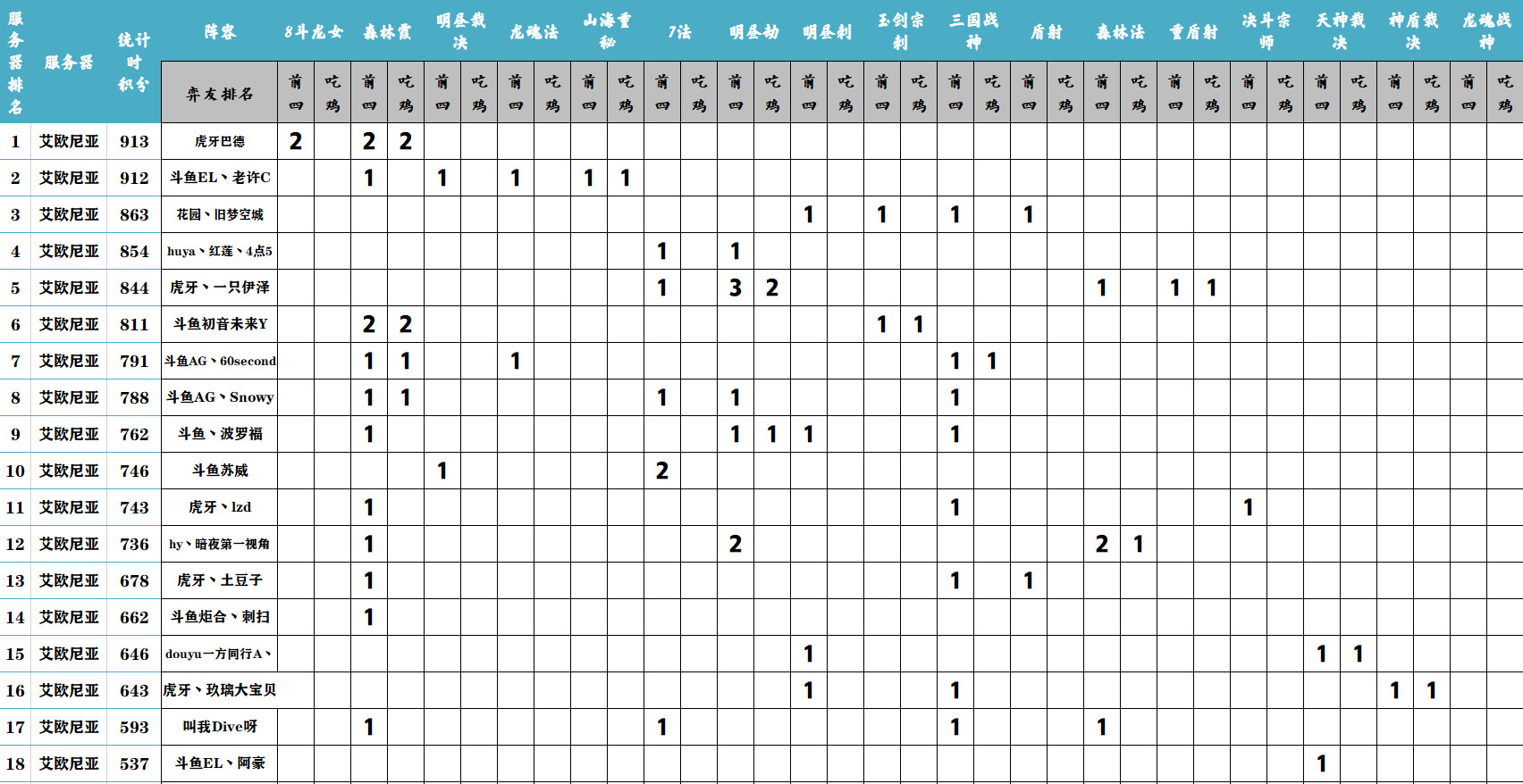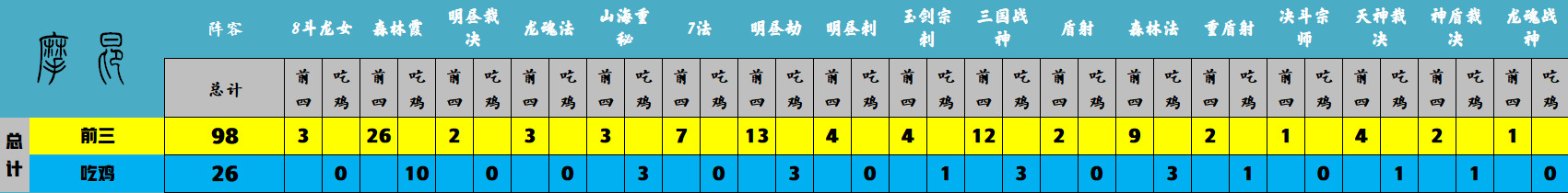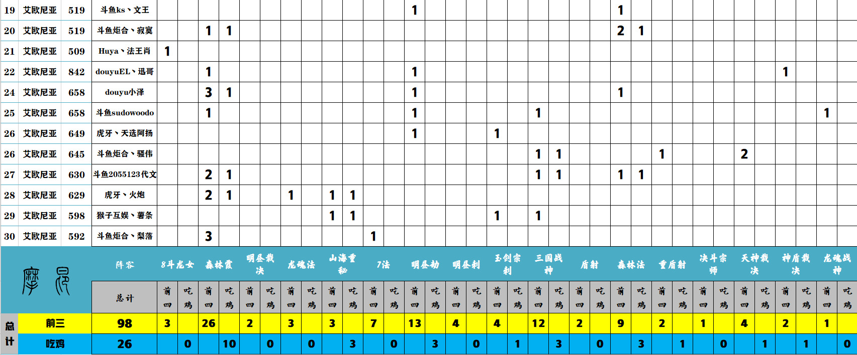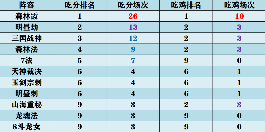 本周统计是S4.5赛季第一次统计,新赛季阵容还不够稳定且还存在版本毒瘤霞的存在,吃分数与吃鸡数与往期相比相差太大。