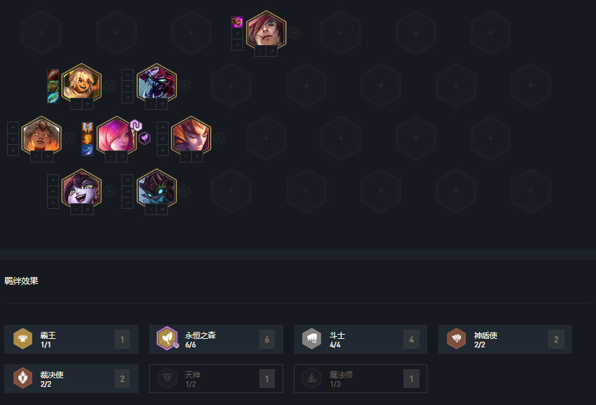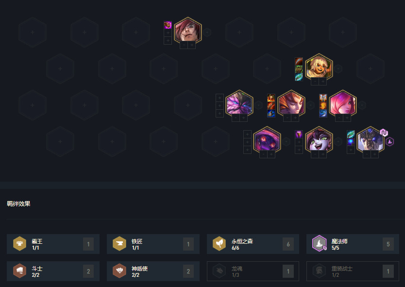 上图为森林法最强的状态,C位选择龙王、霞、洛、努努选择其二,如果没有铲子,正常就是6森三法阵容,但强度与5法差距很大。这套阵容在目前是比较稳定上分选择,对森林斗霞阵容相对克制,龙王双倍施法必定打出霞的复活甲。