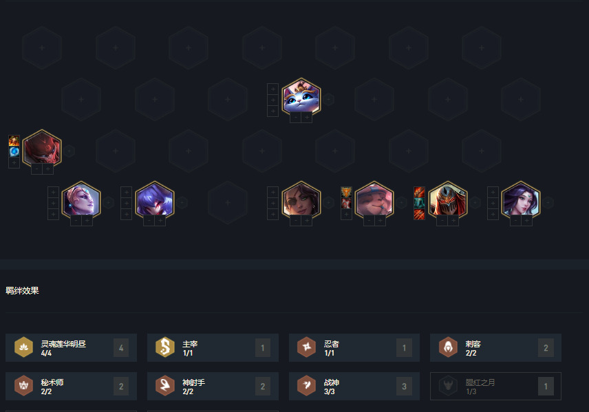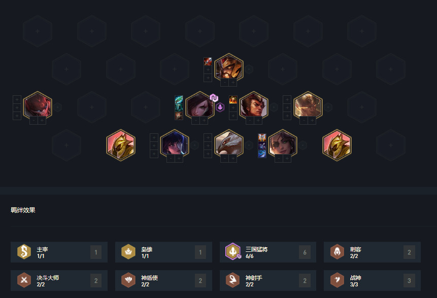 这版本三国阵容与上版本略微改动,通常挂三战神如果蛮子装备好挂李青,否则还是瑟提更优质。三国阵容成型后强度很高,但很吃三星卡特、2星莎弥拉与瑟提,大成要求极高,但大成后吃鸡很容易。玩的人不算多,偷分比较稳定。