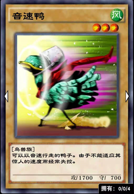 【音速鸭】,目前鸟兽族的打手担当,配合场地卡有1900攻击力,遇到带攀登高峰的白龙卡组,有2100攻击力,不虚任何下级怪兽。且3星不怕【四星瓢虫】的翻转效果。建议满3