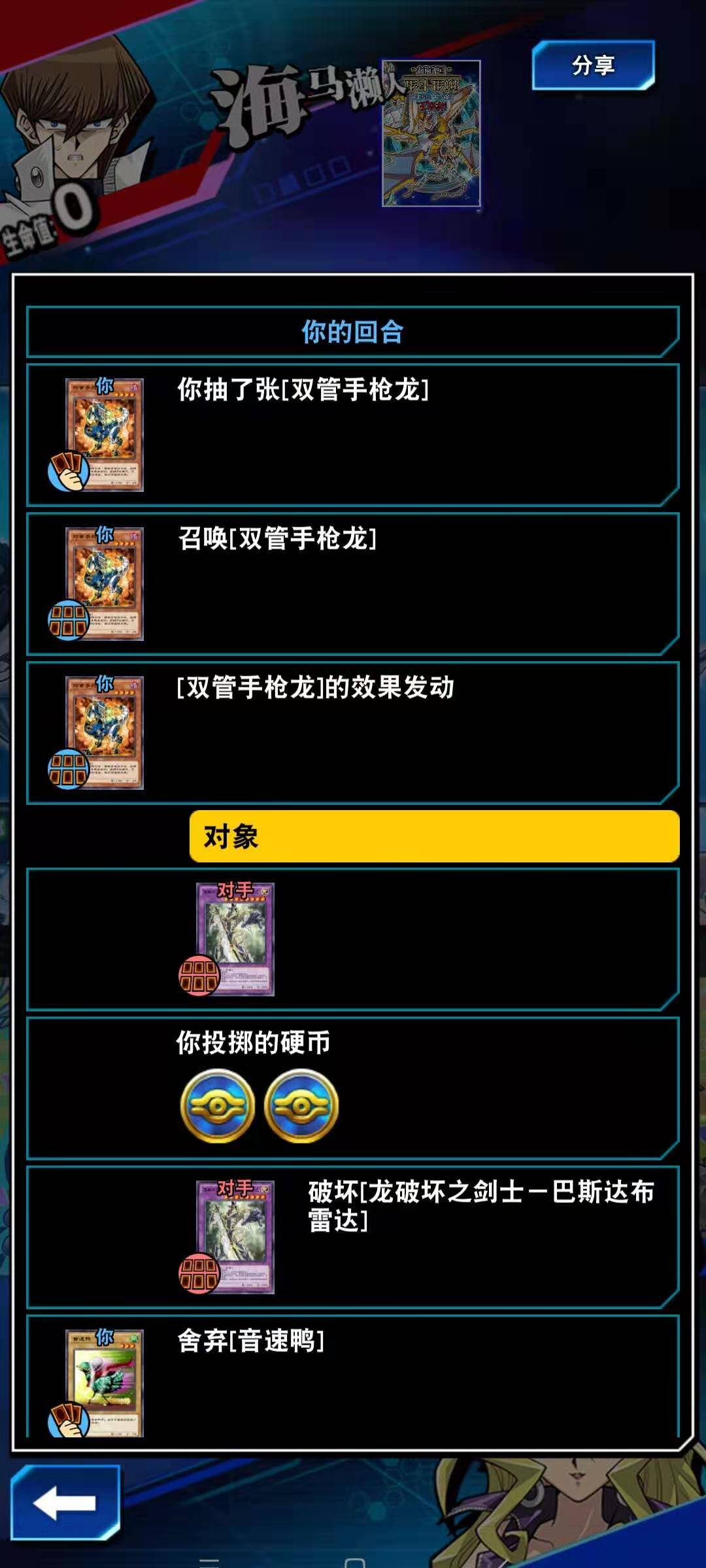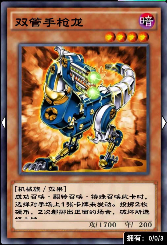 【双管手枪龙】,1700打点算是合格,其效果的1/4概率炸一卡,在决斗中还有一个重要的功能,就是判断对手的盖牌类型。在这里把我总结的“读心术”分享给大家:①手枪龙点对方卡后,如果没有出现对方的思考时间直接投币,那对面盖牌都是【同路人】【心镇壶】这种需要满足发动条件才能发动的卡。②手枪龙点对面后场盖牌时,如果出现了对方思考时间,但对方很快就PASS了,那被点的盖牌大概率是虽然可以发动,但如果配破坏了,发动了也没有意义的盖牌,例如【金属化·魔法反射装甲】【银幕的镜闭】【锁链飞镖】。③手枪龙点对面后场盖牌时,如果出现了对方思考时间,且认真思考了一段时间,则被点的盖牌大概率是可以发动影响局面,但现在发动很不甘心的盖牌,例如【敌人控制器】【给死者的供奉】【伊塔库亚的风暴】。这套读心术在高分段尤其好用,因为对手会很仔细地斟酌手枪龙这1/4成功概率对局面的影响。当然这1/4概率的炸卡效果有时候也会帮你逆转战局。