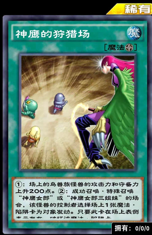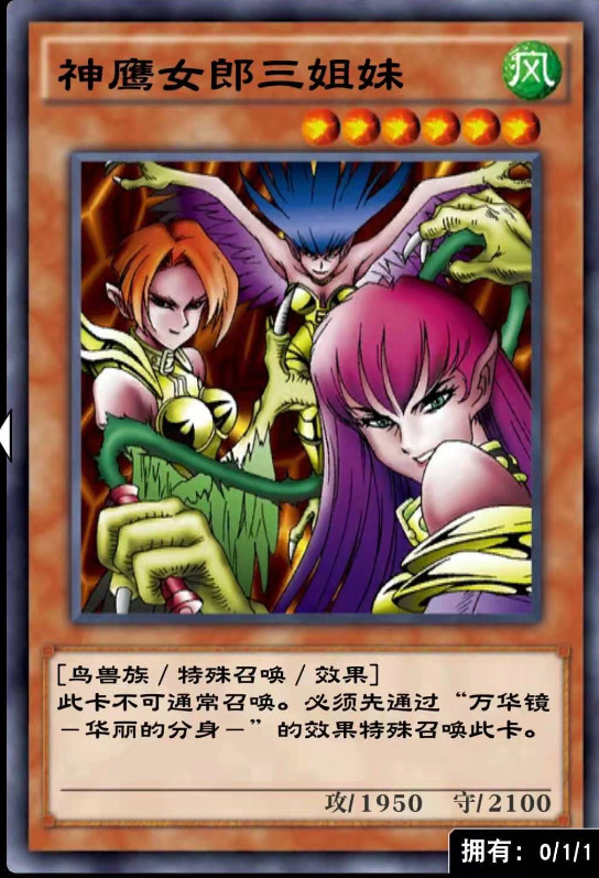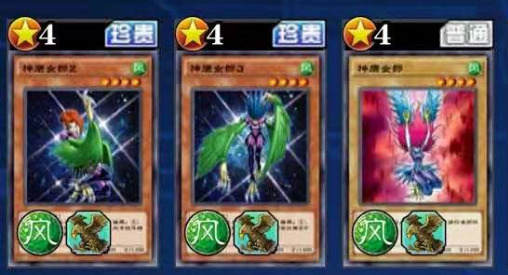 不得不说刚开服卡池确实很浅,神鹰卡组可选的怪兽卡比较少。其中【神鹰女郎1】为孔雀舞35级后代替凡骨【神鹰女郎】的代替卡。这里为大家介绍几张天梯不常见的怪兽卡:
