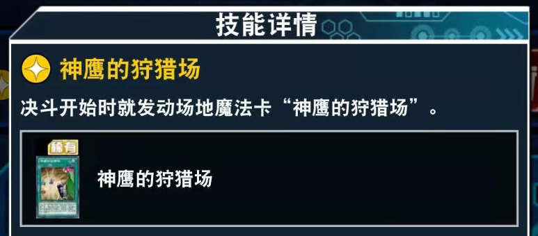 关于这个技能我想额外说两句,DL国际服已经运营四年了。这期间,太多技能遭到削弱,包括通用技能【平衡】【重新开始】,也包括专有技能【准备决斗】【寄生虫感染】。这次的主角【神鹰的狩猎场】也在国际服运营一年多的时候遭到削弱,效果改为“决斗开始时,将一张神鹰的狩猎场放置在卡组最上方”。