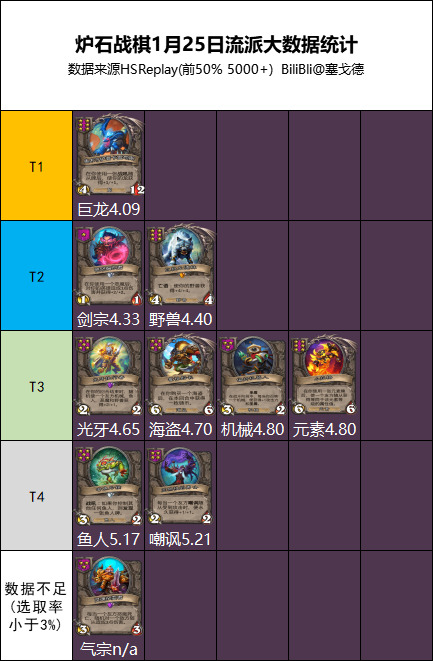 除此之外,光牙流(杂毛流/多种族buff流)也跌了很多,从T2跌入T3,我看了一下HSreplay的阵容算法,跟之前没有什么不同,只能猜测这几个版本加入了大量非流派随从和打工随从,稀释了buff随从的卡池,单铜须无法追上其他流派高本核心的成长速度,进入前4的光牙流基本都至少需要双光牙或者单铜须单光牙,所以你4碰5出铜须先别急着笑,搜不到buff随从还是弟弟,看到其他核心该卖铜须还是不能犹豫。
