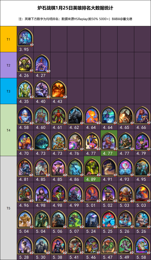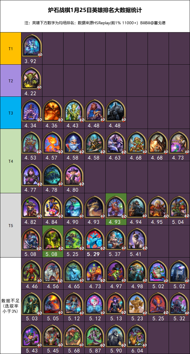 本周英雄均场排名幅度曲线越来越大,原本不多的T1英雄也都落入T2,T2英雄大量落入T3,环境越发畸形,甚至连拉法姆和米老头这种常青藤在高位局也跌入T3,均场排名都降到4.5之下,女巴和玛维更别提了。而两个新英雄均表现不佳,新树人雷哥可以看作大号的死亡之翼,能有效配合亡语体系和嘲讽体系,但毕竟这2个流派本身还是不够强,主要还是只能用来中期过渡上本,后期还是要找高本核心;奖品哥基本就全靠运气了,如果奖品发的好,能安全上本,但大概率还是比较难受白板。