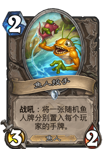 而我们的构筑与之不同,既然追求刺激,就要一 贪 到 底。仔细端详传统的鱼人骑,其中有诸多功能组件、资源组件和buff组件与开赛集结的质量相冲突,如1费的毒鳍鱼人、2费的鱼人投手和奖品商贩、3费的寒光先知。虽说4费复活出这些随从也还行,但还不至于达到压力拉满的效果。因此开赛集结只能作为一张外挂返场。