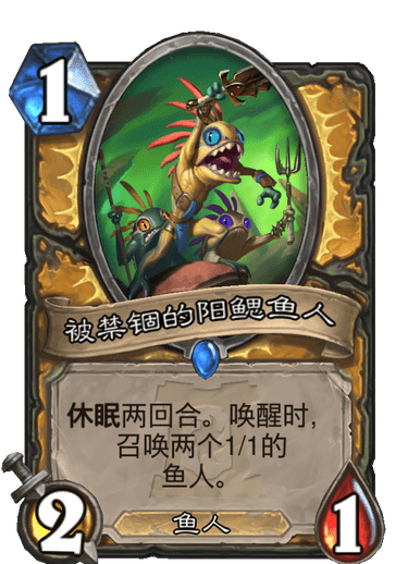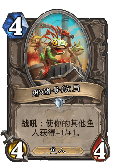 鱼人骑已经是老生常谈的卡组了。在棱镜退环境后,标准的鱼人骑又收获了被禁锢的阳鳃鱼人、莫戈尔·莫戈尔格、鱼竿、邪鳍导航员这四张卡,从此鱼人骑由鱼人为王的超展开开始转型:一种是压低曲线,变成1费禁锢鱼人、3费寒光智者、后续不断按费拍鱼buff取胜的卡组;另一种是将鱼人融合进宇宙体系,通过鱼、龙之间的相互联动和鱼人为王快速过滤牌库、找到宇宙组件来取胜。